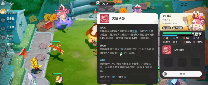 大口糕作为一名后排辅助型魔法输出精灵,其元理为“饱足”,特性则是“小天使”。它的技能名为“快意大快朵颐”,分为主动和被动两种效果。